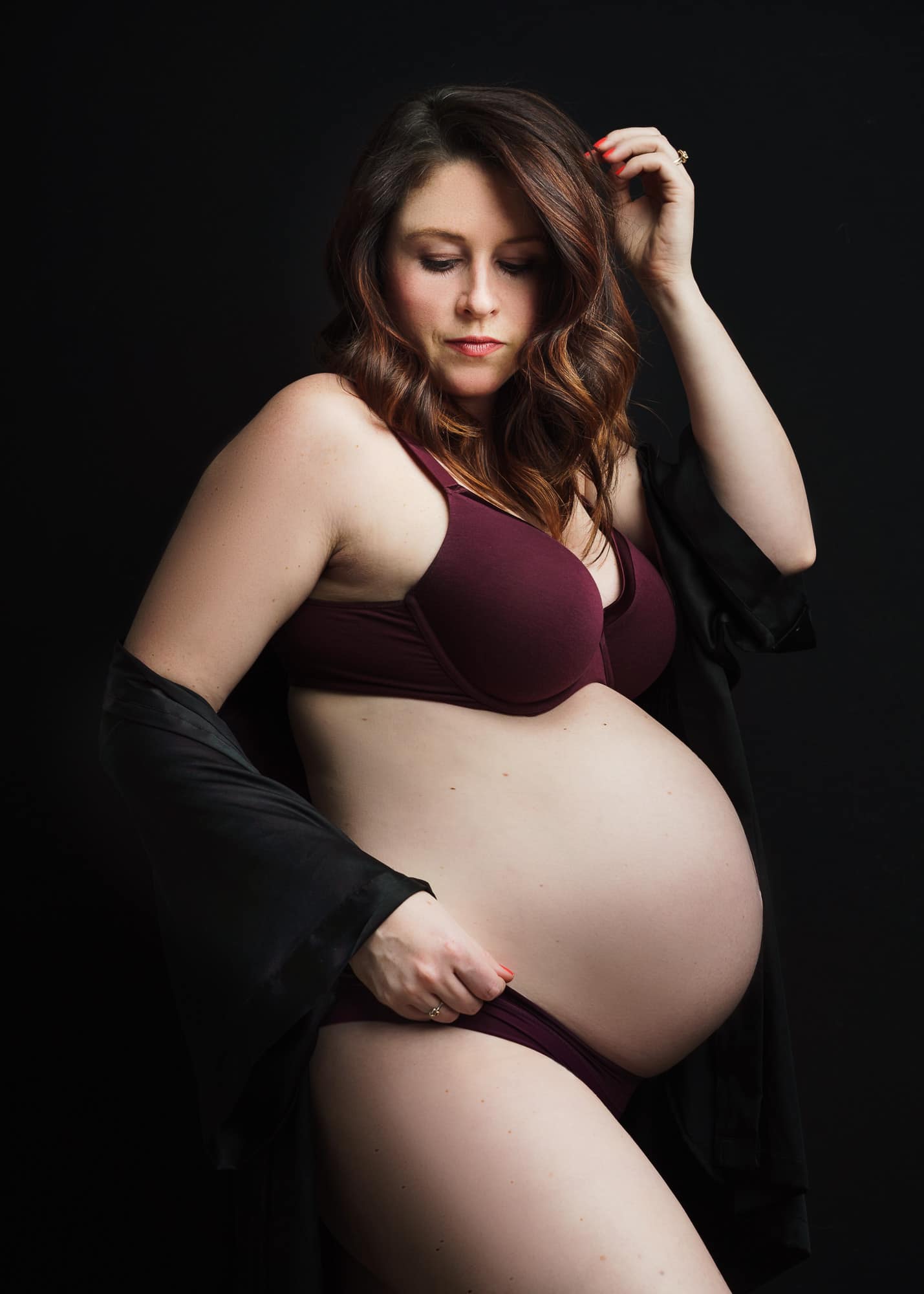 We do most of our photo shoots outdoors but before the pandemic we also did shoots indoors. Although we do bring some lighting gear outdoors, indoor shooting allows us to really take advantage of all of our lights and gels. Lighting really helps show off the curves of beautiful pregnant models!
